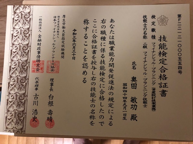 FP試験の合格証が届きました。