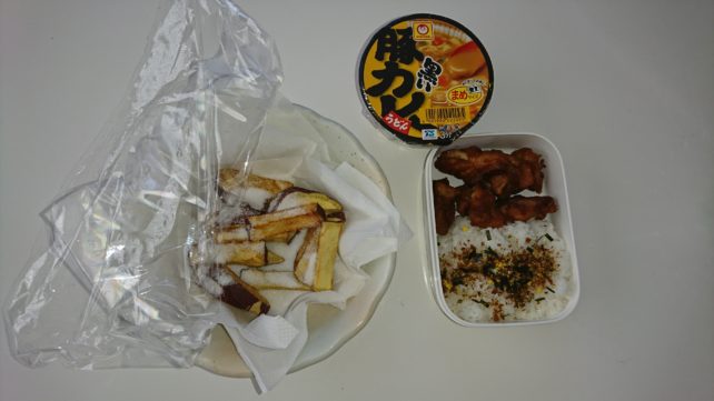 素揚げしたサツマイモに砂糖をかけただけの甘いポテトフライも付け簡単10分弁当