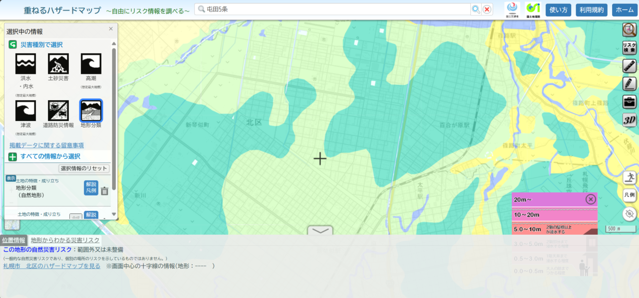 - ハザードマップ~こちらも住所で検索すると、【洪水】【土砂災害】【高潮】【津波】【道路防災情報】【地形区分】などの項目からその土地の情報を得られる。
