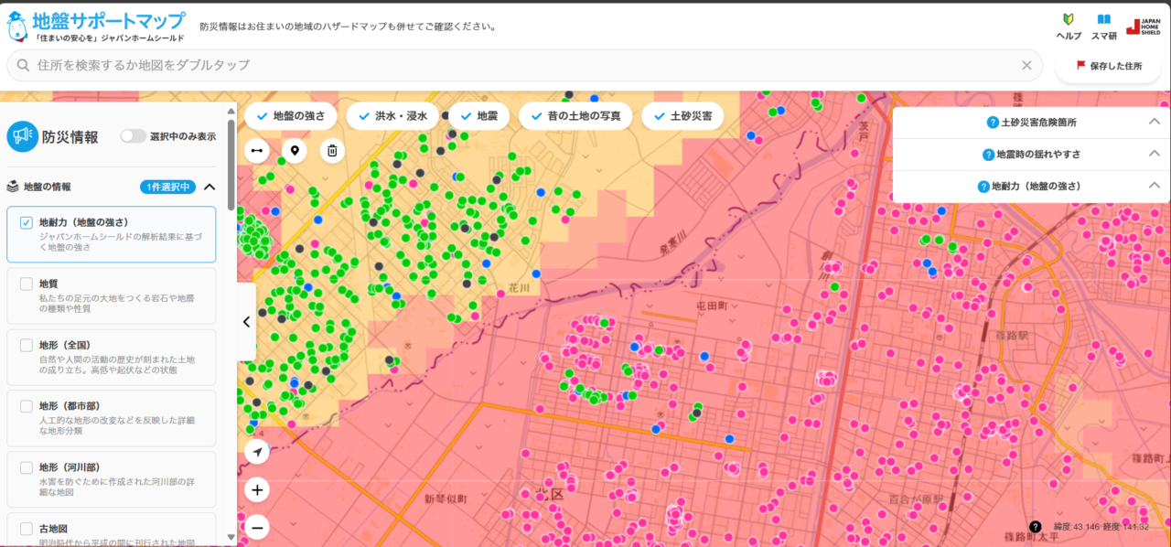 - 地盤サポートマップ~住所を入れて検索すると、【地震】【液状化】【土砂災害】【浸水】の4つの災害時のリスクレベルがわかる。また、マップ内に避難場所や公園のマークも記載。