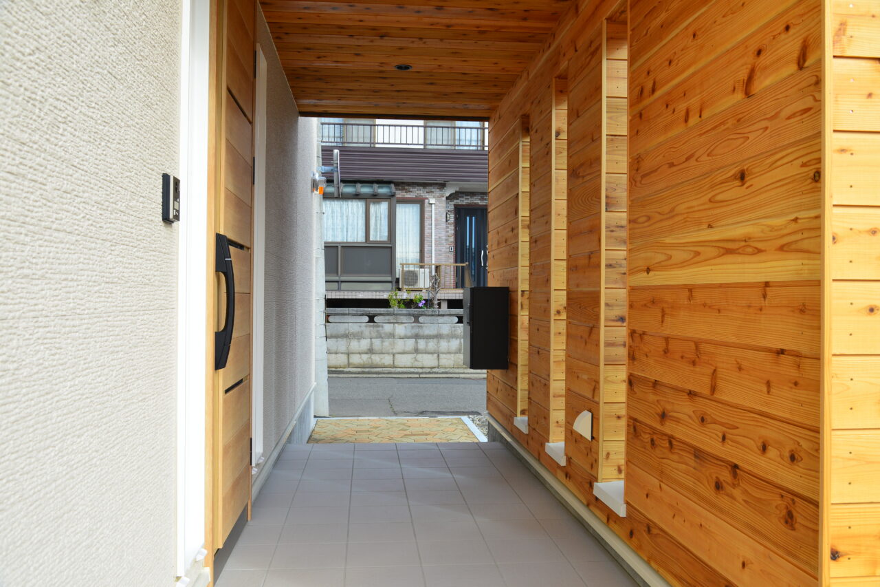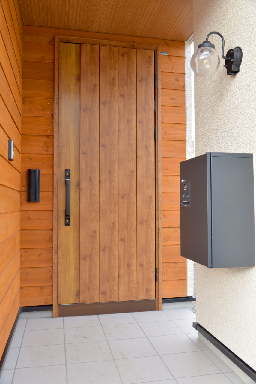 玄関まわり全体をウッド調にすることで、ポーチとのつながりが生まれ、家全体の雰囲気が格段に上品になります。
