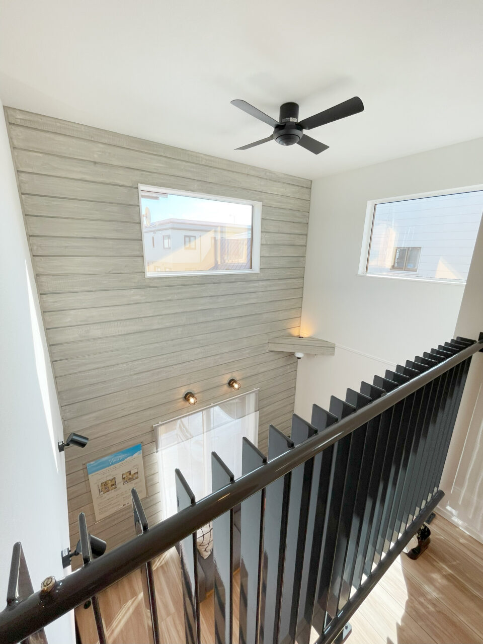 吹き抜けまでアクセントを伸ばすと縦方向の広がりが強調され、空間にダイナミックさが生まれます。木×グレーという組み合わせは、ナチュラルとモダンの両立がしやすい人気のデザインです。