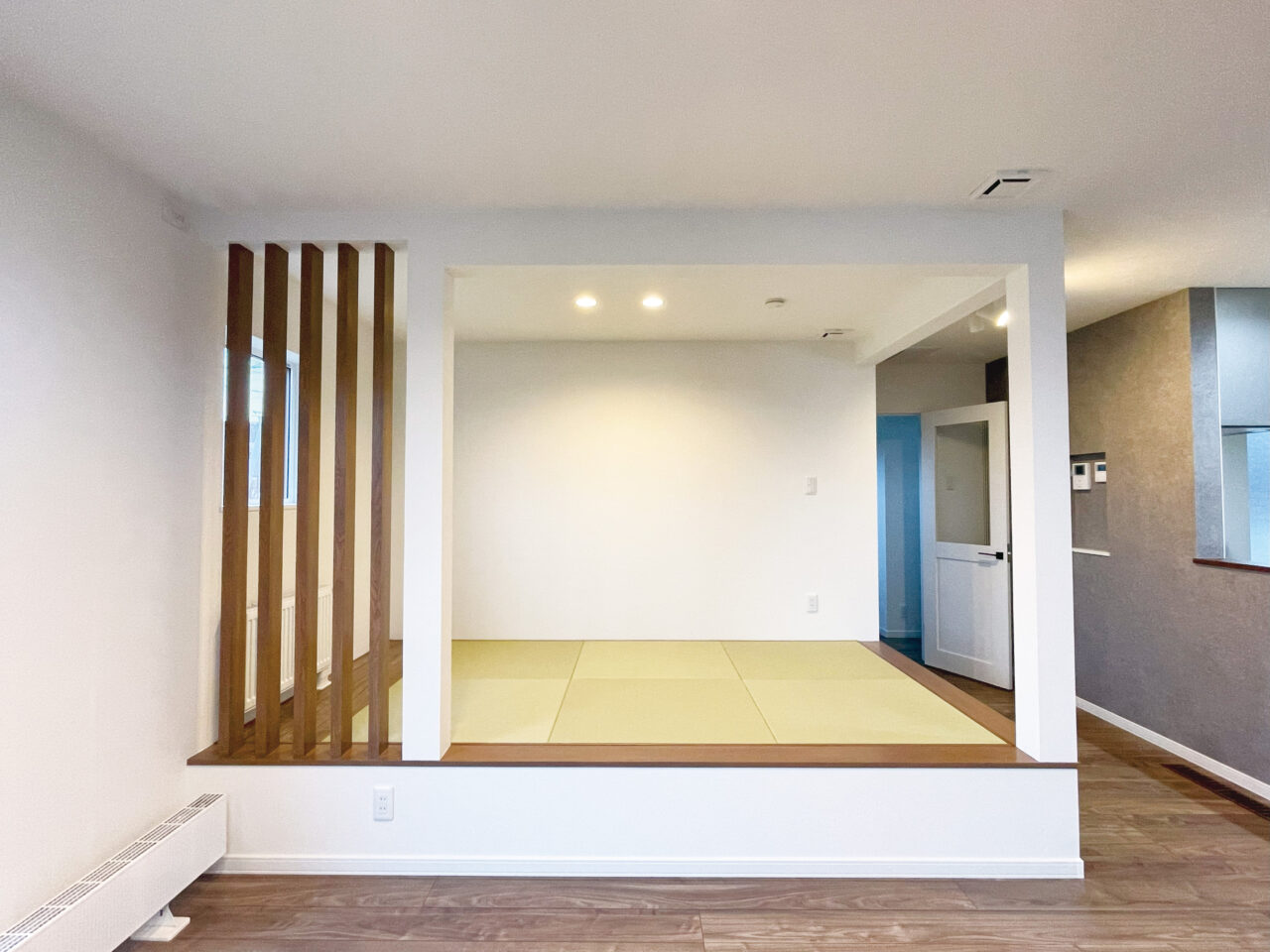 例えば、くすみグリーンの畳を採用すると、和室の印象が一気に変わります。さらに柱ルーバーを設けることで、空間のアクセントになります。