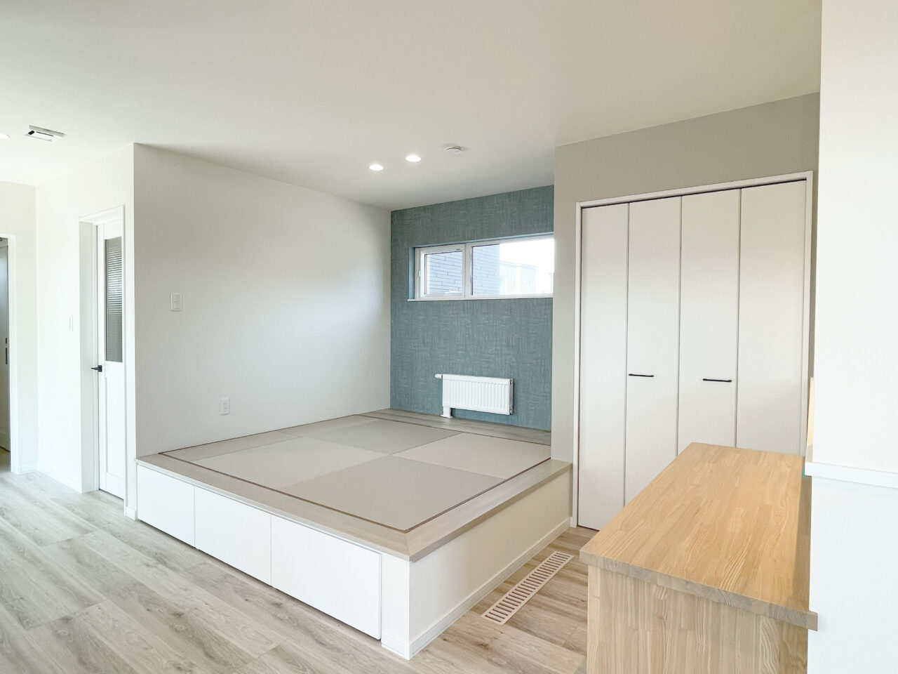 淡いベージュの畳を選ぶことで、和室特有の重たい印象を軽くすることができます。さらにくすみブルーのクロスを合わせると、落ち着いたカフェのような雰囲気になります。