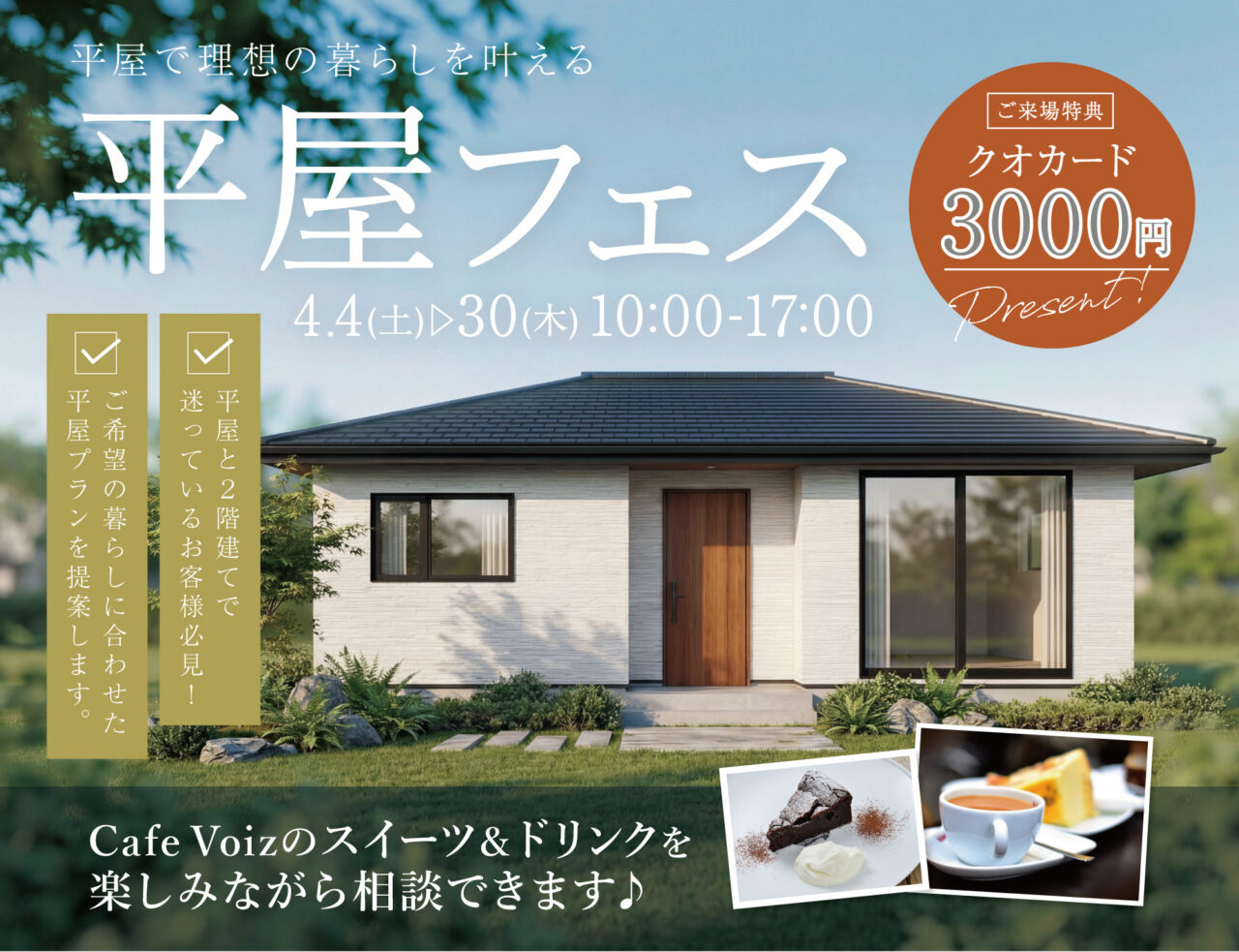 併設カフェ[CAFE VOIZ]のスイーツとドリンクを楽しみながら、平屋のプラン紹介や土地のご相談などができます。