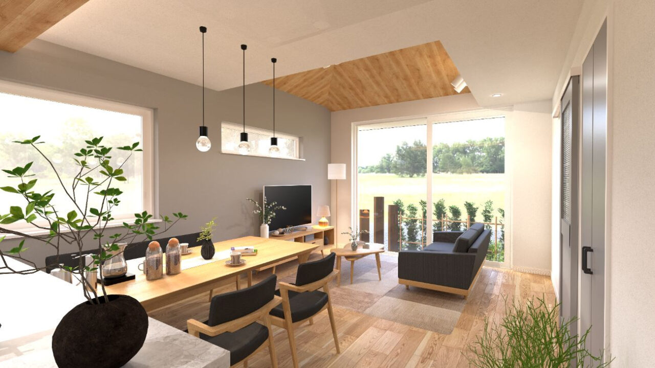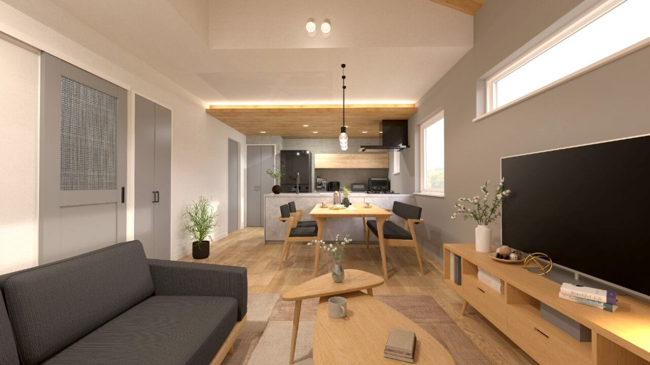15.8帖のLDKは平屋ながら開放感を感じる勾配天井。木目のクロスでジャパンディな空間を演出します。