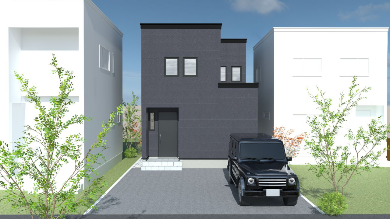 重厚感あるダークグレーの外壁に、2台駐車が叶うゆとりの外構。上質さと実用性を兼ね備えたスタイリッシュな外観です。