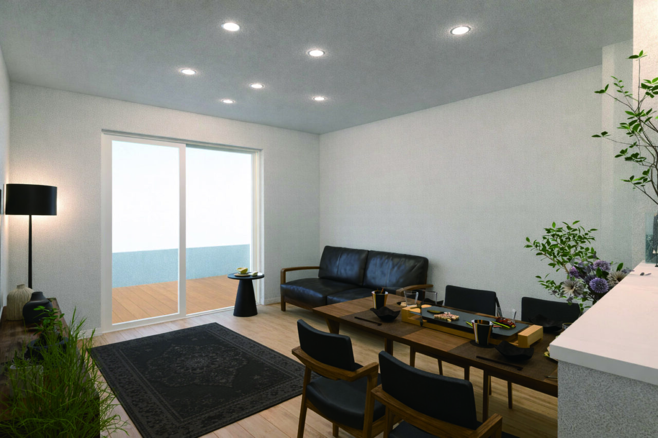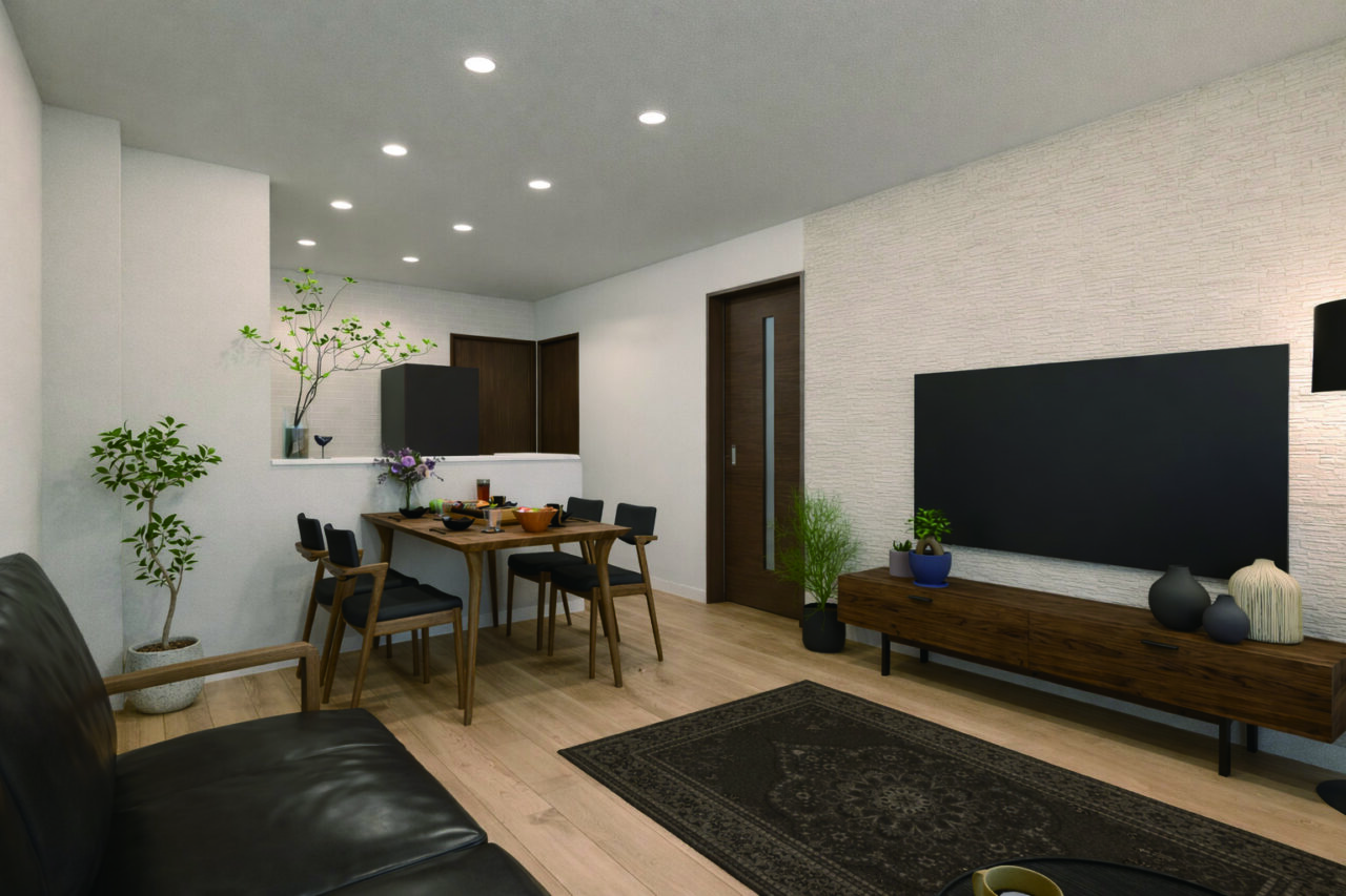 14帖のLDKは寝室、ユーティリティにもアクセスできるスマートな設計。みんなで映画を観たり、お茶をしたりと家族が集まる明るいリビングです。