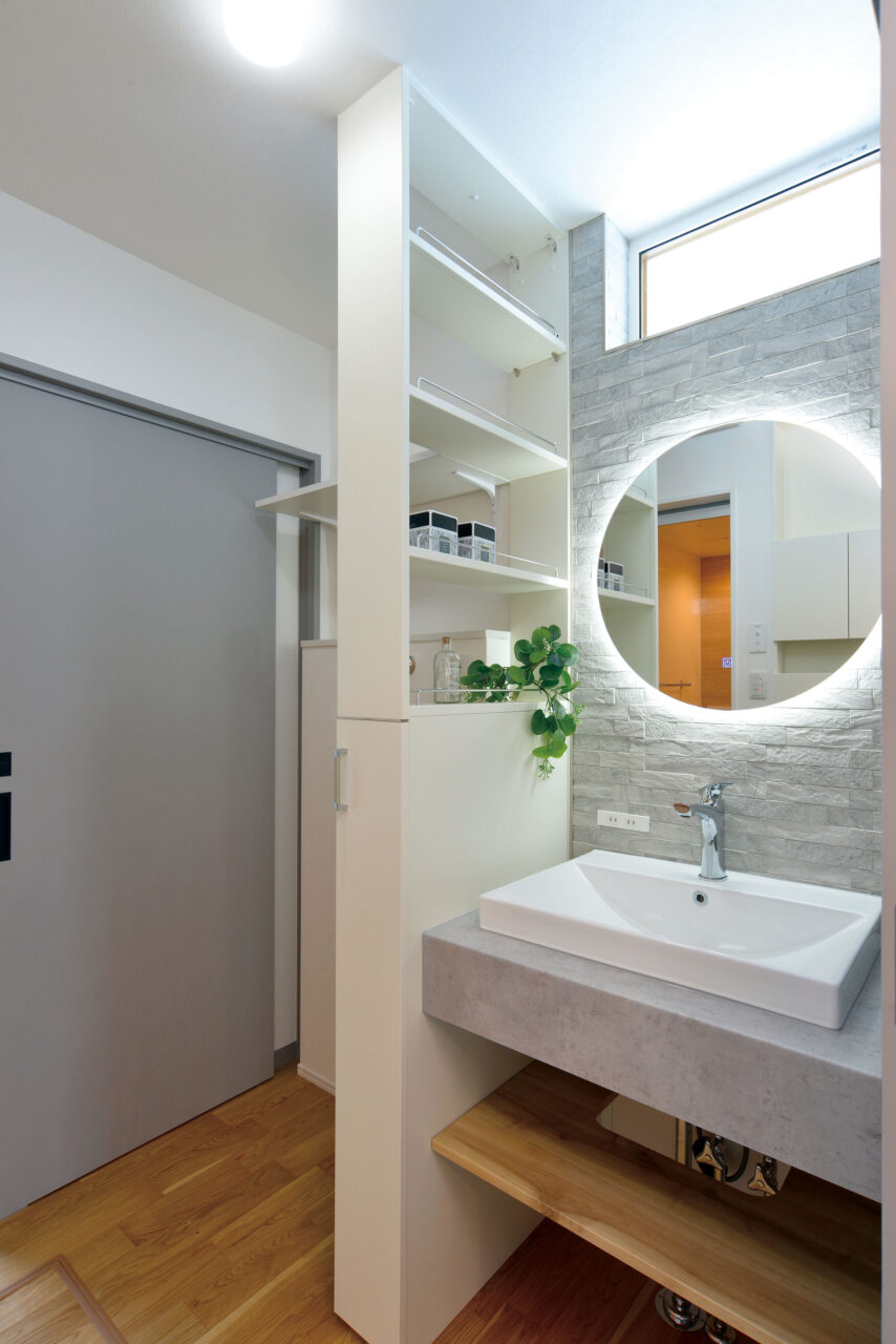 キッチンから寝室に抜けられるウォークスルーのユーティリティ。歯磨きや入浴後すぐに寝室へ行け、バリアフリー性も◎
