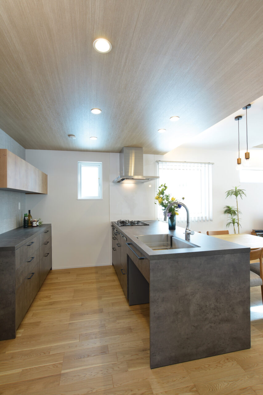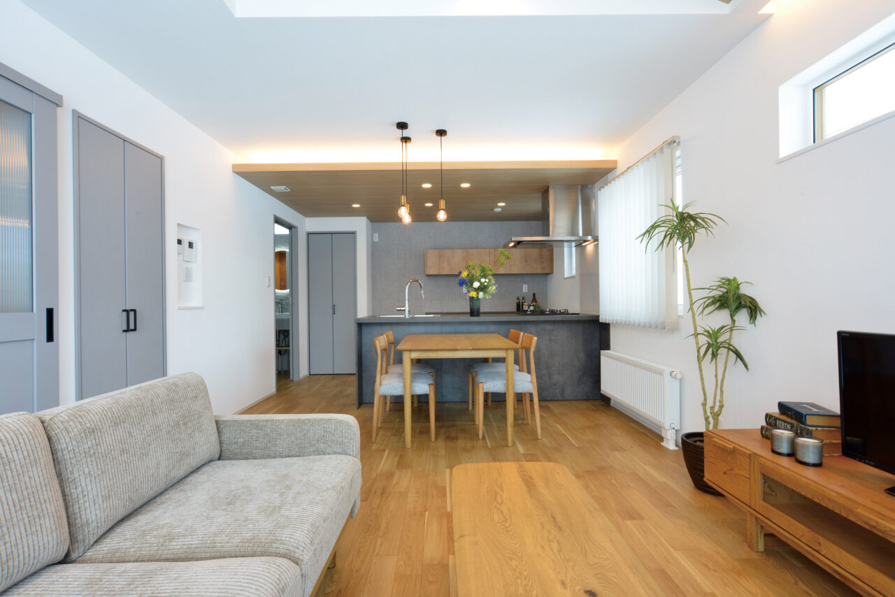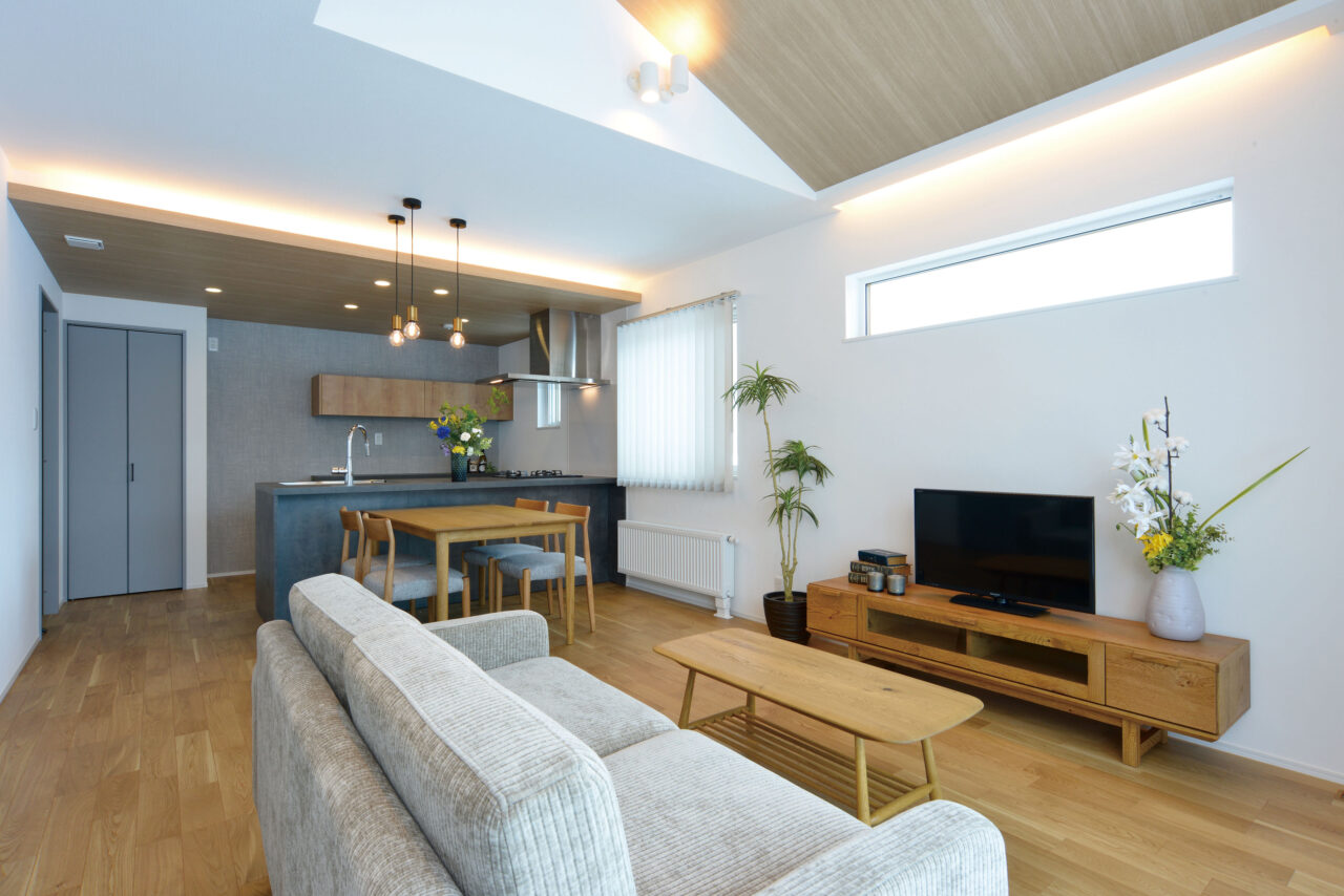 15.8帖のLDKは平屋ながら開放感を感じる勾配天井。木目のクロスでジャパンディな空間を演出します。