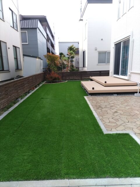 弊社モデルのお庭です。ちょっとした紅葉があり、ウッドデッキで夏はバーベキューができます。