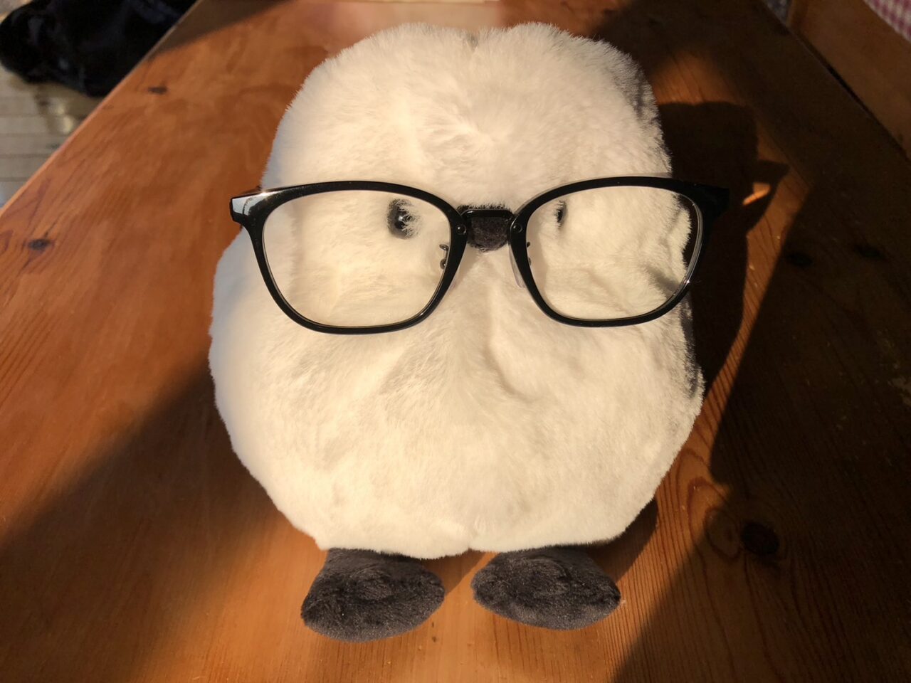 シマエナガのぬいぐるみが、なぜかメガネ置きに使われていました。シマエナガもまさかメガネ置きに使われるとは想定してないでしょうね😅