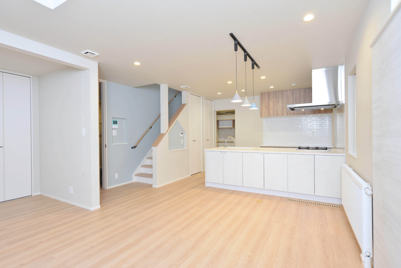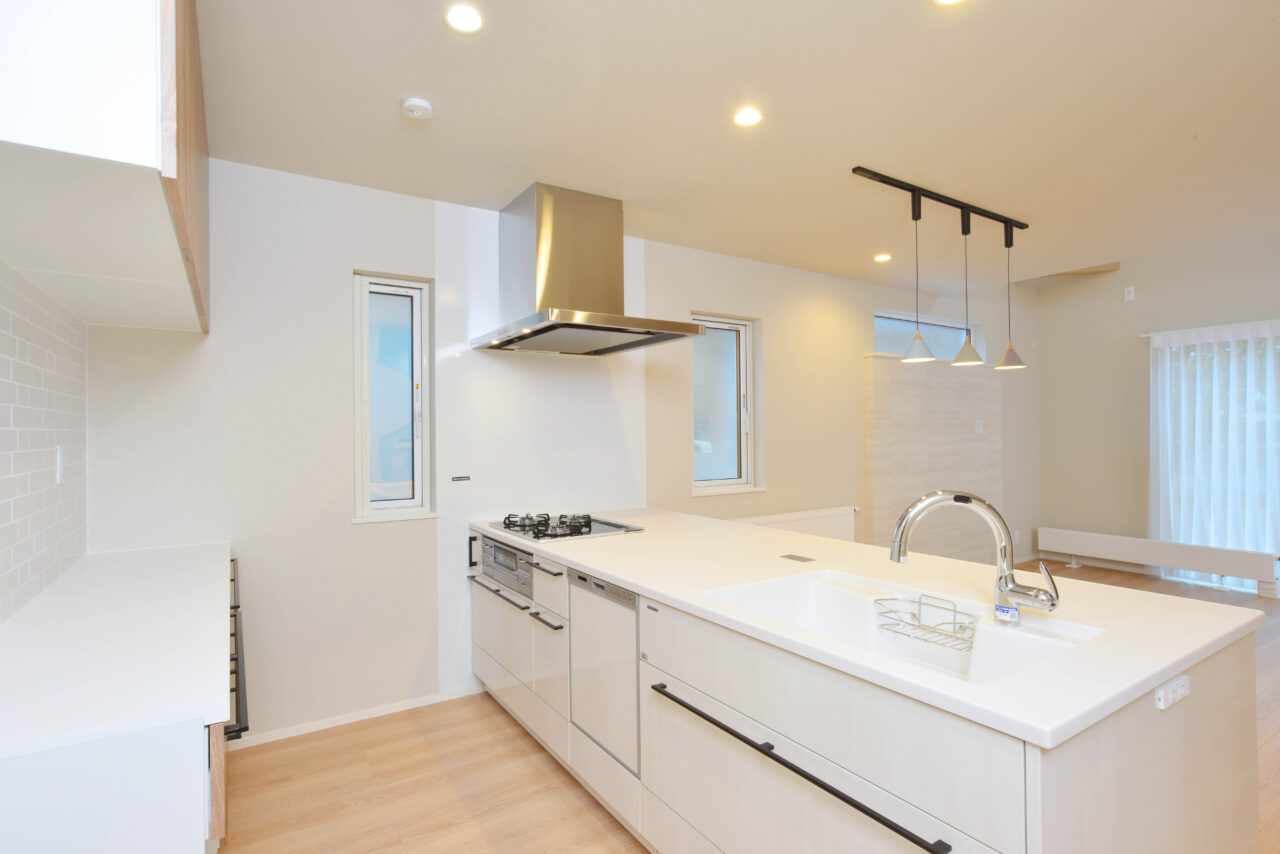 清潔感あふれる白のキッチンは、整った動線と十分な収納力が魅力。手元を照らす光、手触りの良い天板、暮らしを想像して丁寧に設計された空間は、使うたびに“心地よさ”を実感させてくれます。
