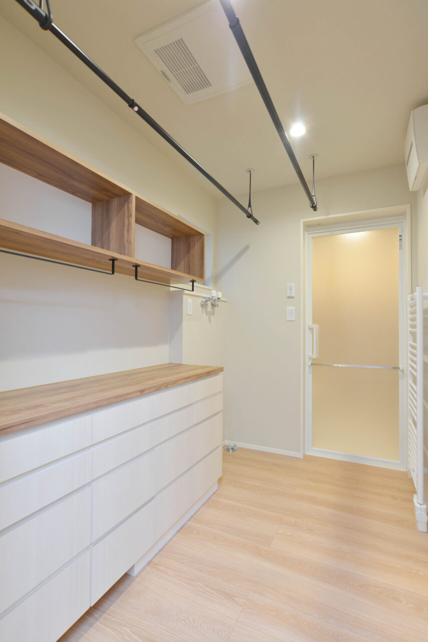 洗う・干す・しまうを一か所で完結できる、家事ラク動線のランドリールーム。天井から吊るされたアイアンバーと木目の棚が、実用性のなかにも洗練された雰囲気を添えています。たたんだ洗濯物をそのまま収納できる引き出しやカウンターがあり、毎日の作業にほんの少しのゆとりをもたらします。
