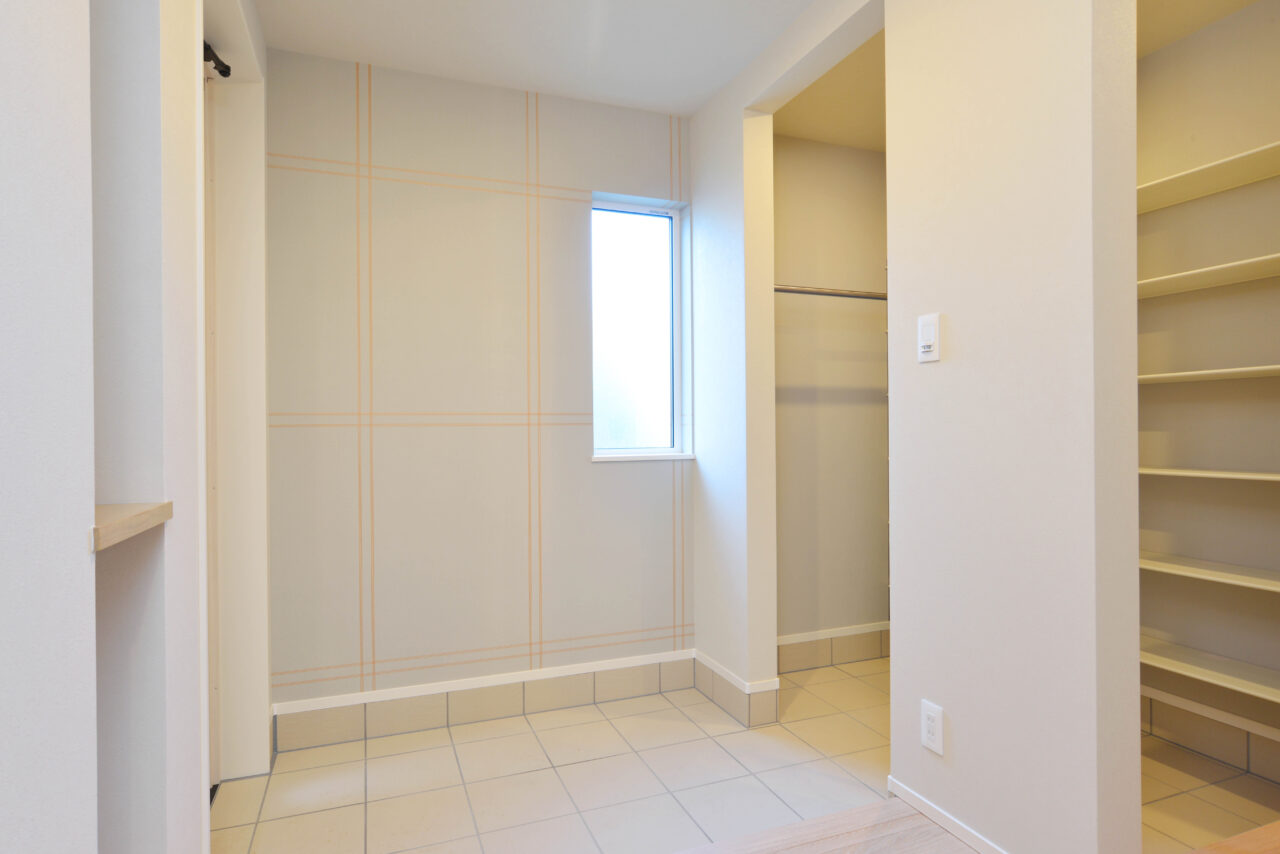 すっきりと整えられた玄関には、たっぷりの収納スペースが。日用品やアウトドア用品、季節の道具までスマートにしまえて、いつでもきれいを保てます。アクセントクロスにさりげない遊び心を加えたことで、実用性のなかにも温かみを感じるデザインに。「帰ってくるとほっとする」そんな、家族の原点となる空間です。