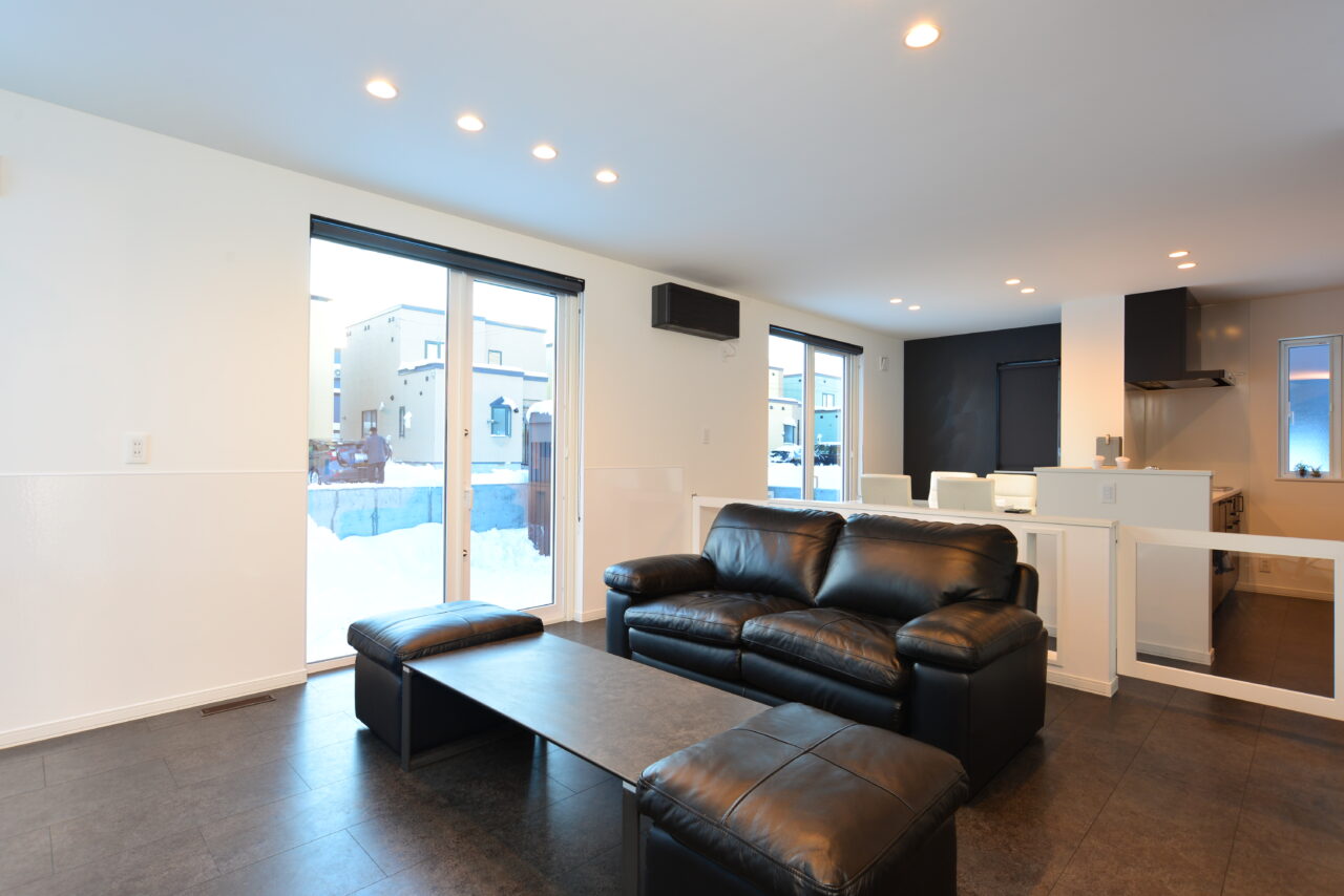 大きな窓からたっぷりと光が差し込み、昼間は自然光で満たされる心地よいリビング。ブラックのレザーソファとダークトーンの床が調和し、落ち着きのある上質な時間を演出します。外の景色を眺めながら、愛犬と一緒にゆったりと過ごす時間は、まさにこの家ならではの贅沢。シンプルな空間の中に、家族の笑顔やぬくもりが自然と溶け込んでいきます。