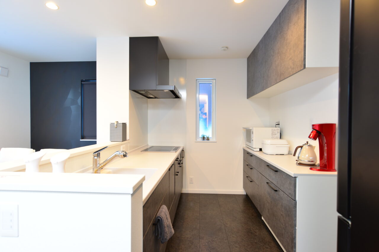 白とグレーを基調としたキッチンは、清潔感とモダンさを併せ持つスタイリッシュな空間。上下に配置された収納が機能的で、調理家電もすっきりと収まります。料理をしている時間もインテリアの一部のように美しく、作業動線もスムーズ。ダイニングとのつながりも良く、家族の気配を感じながら会話を楽しめるのも魅力です。日々の暮らしを、さりげなく特別にしてくれる場所になっています。