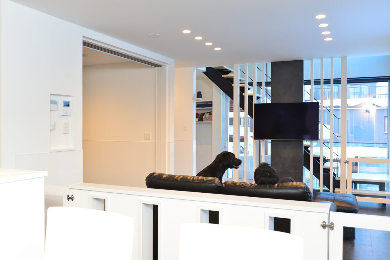 リビングからつながる視線の抜けと、愛犬との心地よい距離感