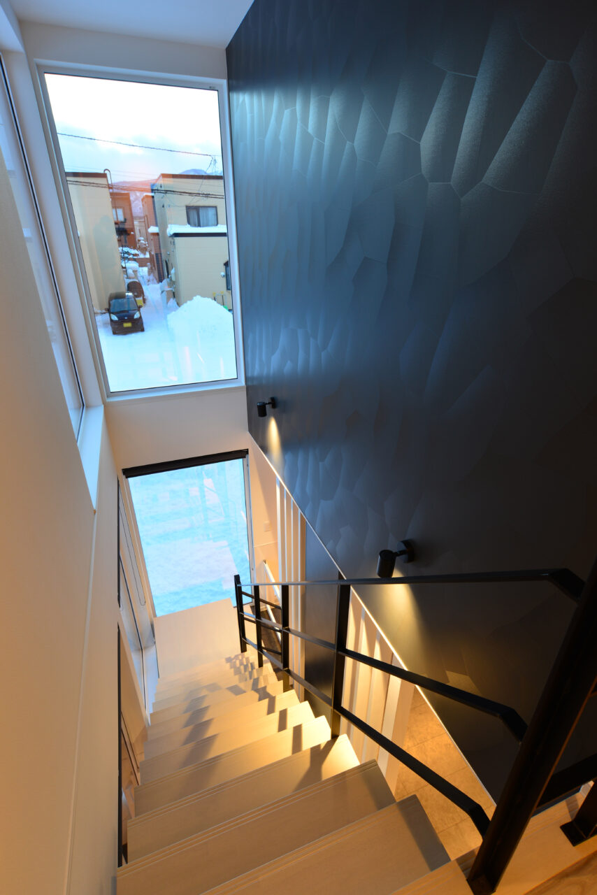 吹き抜けがもたらす光と陰影が、美しい立体感を生み出す階段ホール